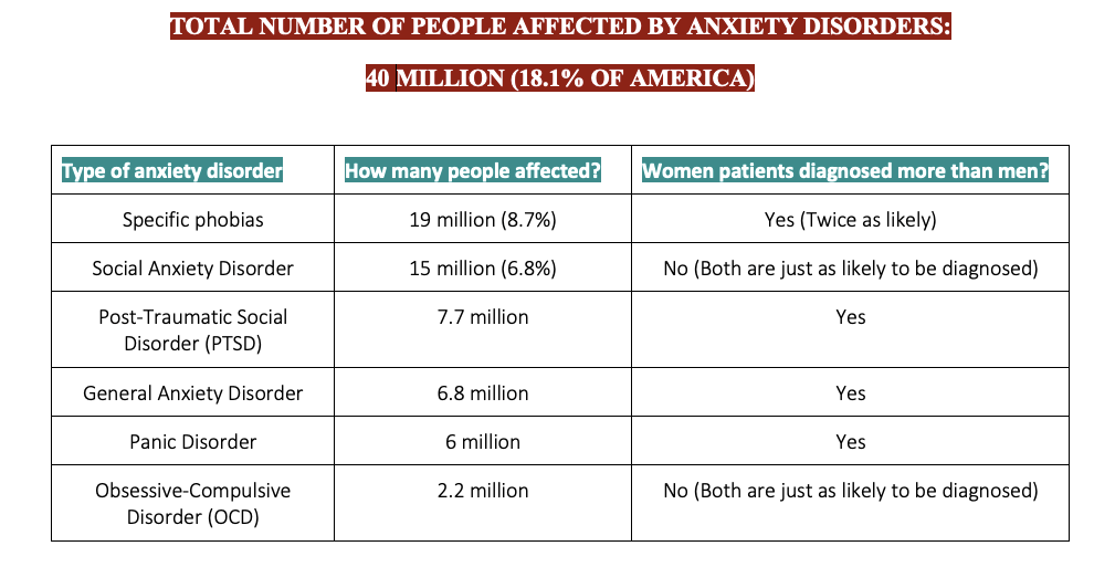 In the US alone, at least 40 million people (18 years and older) are affected by anxiety disorders of some kind every year, making it the most common mental disorder there is. Women are often diagnosed with anxiety disorders more often than men.